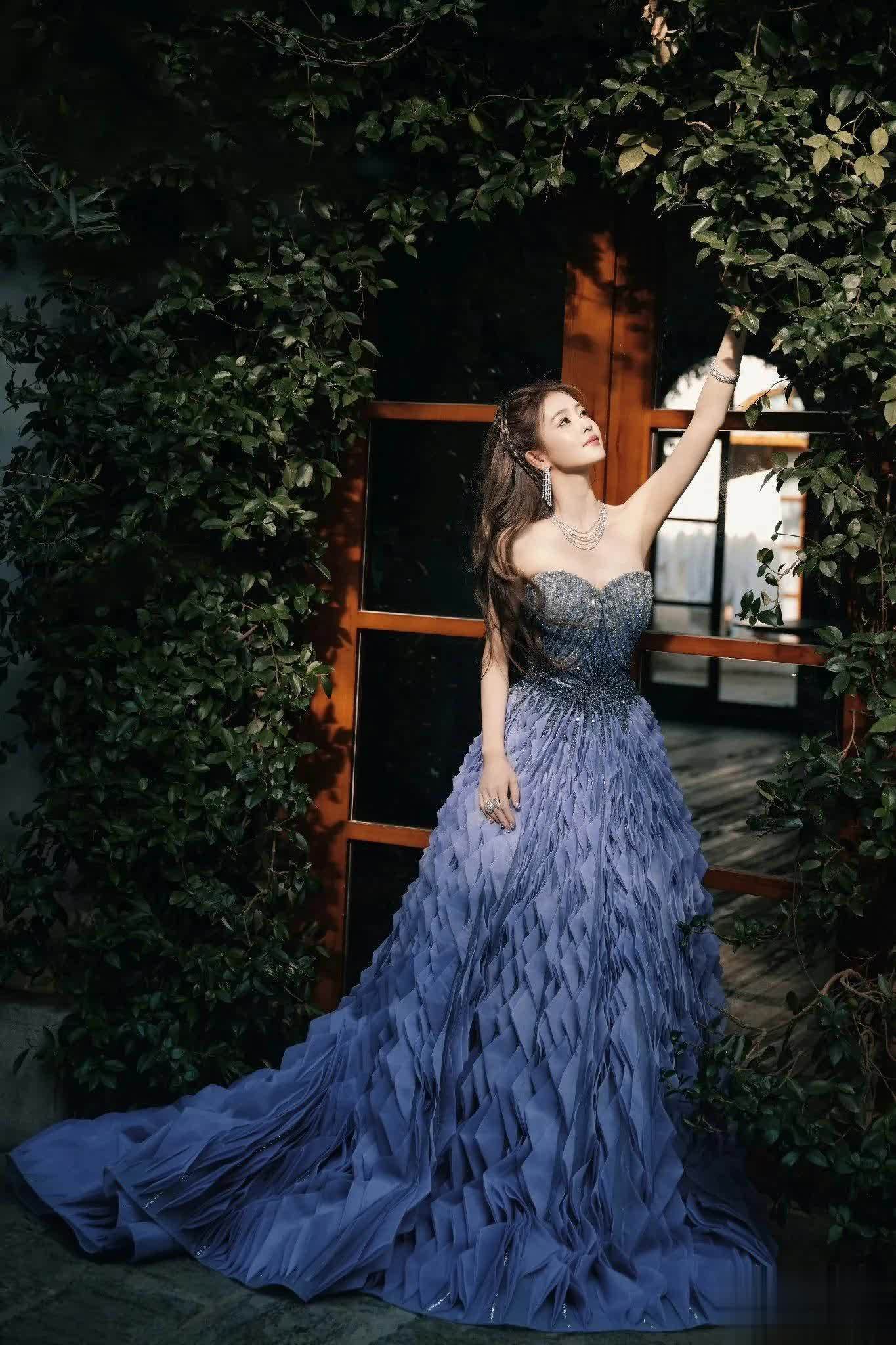 白鹿以侧身回眸的姿态展现完美肩颈线。蓝色抹胸礼服的深V设计凸显背部曲线,编发造型与流苏耳饰更添灵动。这张照片让人注意到她常年坚持瑜伽塑造的优美体态,也展现了她对角色的理解——正如她曾在采访中说过的:“每个角色都需要用身体语言去塑造。”