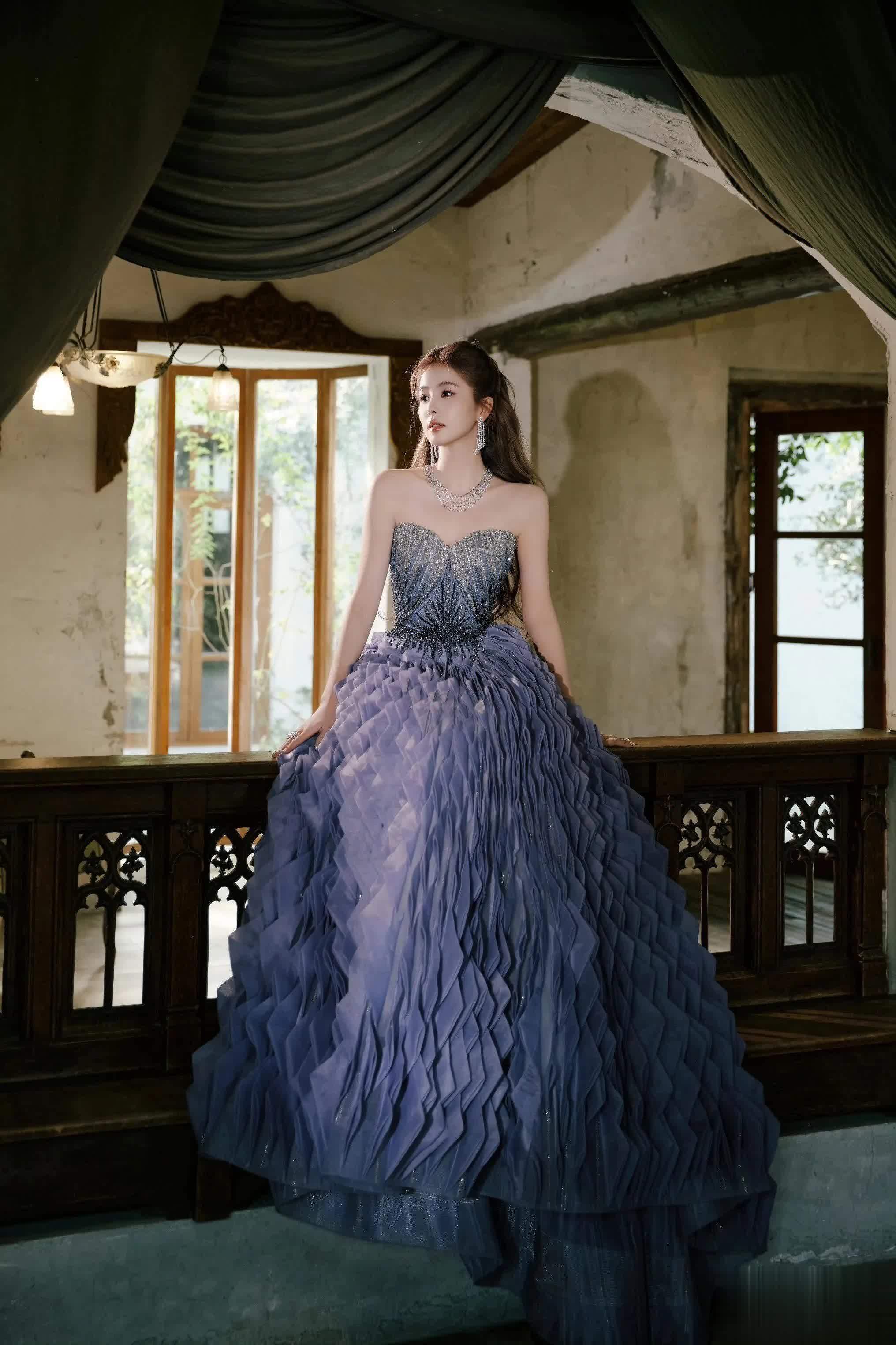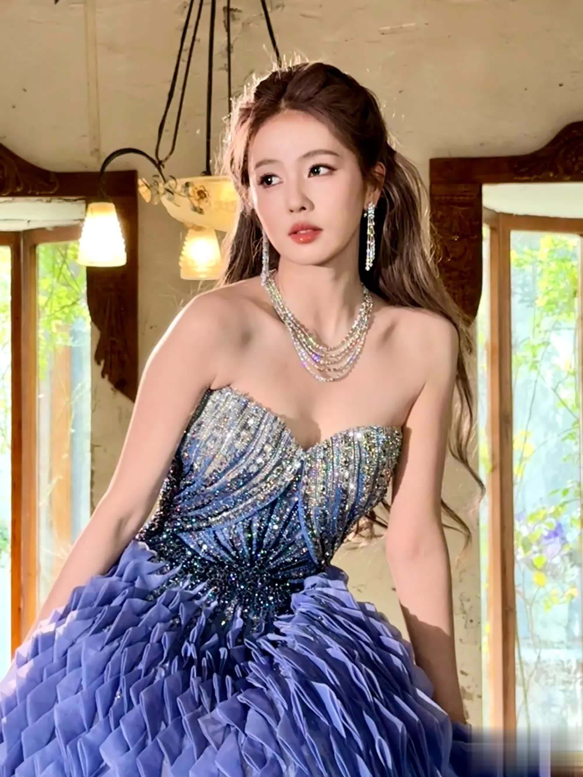 转入室内场景,白鹿的抹胸礼服在银蓝亮片与紫色蓬松裙摆的碰撞中更显梦幻。背景的木质窗框与复古灯具营造出温馨氛围,与她佩戴的多层项链相映成趣。这套造型展现了她对时尚的敏锐度——既能驾驭红毯的华丽,也能在复古空间里演绎出别样风情。