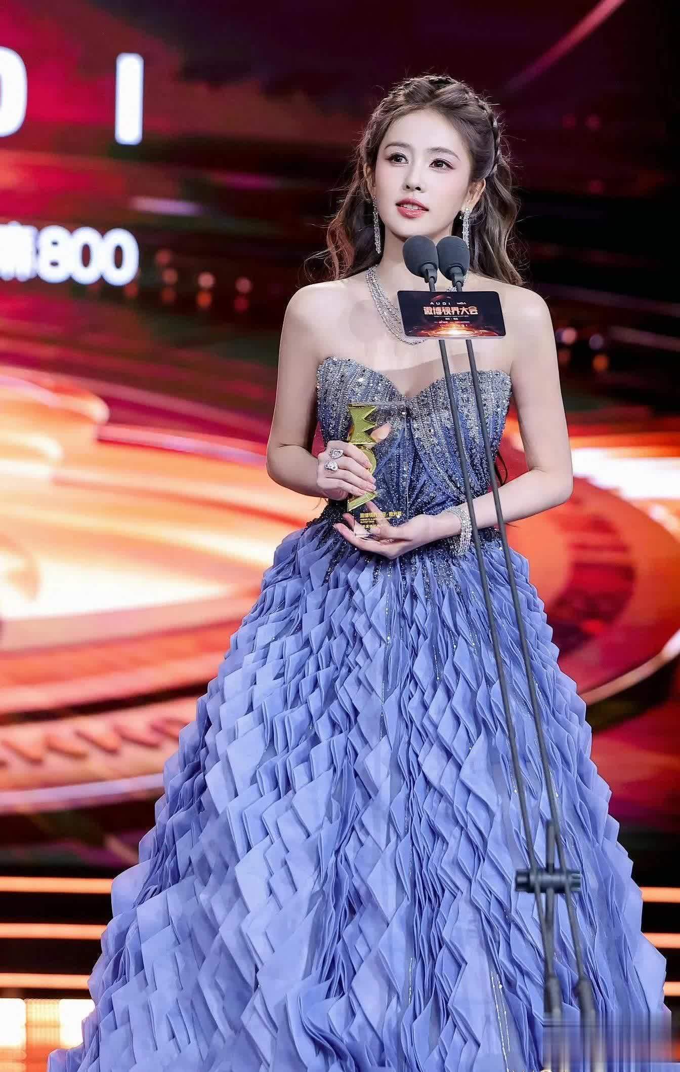 白鹿身着一袭蓝色抹胸礼服,手捧金色奖杯站在聚光灯下。礼服上半身的闪亮装饰与层叠褶皱裙摆相得益彰,宛如夜空中绽放的蓝玫瑰。妆容精致的她将长发优雅编起,佩戴的华丽珠宝与舞台灯光交相辉映。这张来自某盛典现场的抓拍,完美记录了她获奖时的高光瞬间,也让人想起她近年来在影视领域的亮眼表现——从《周生如故》到《长月烬明》,每一步都走得踏实而闪耀。